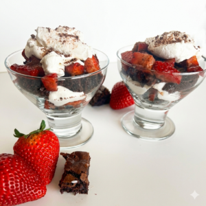 • To make the trifle, in individual serving glasses (or a bigger glass dish) layer the brownies, strawberries and whipped cream. Top the finished dish with a sprinkle of the Chocolate Cinnamon Latte mix and serve.